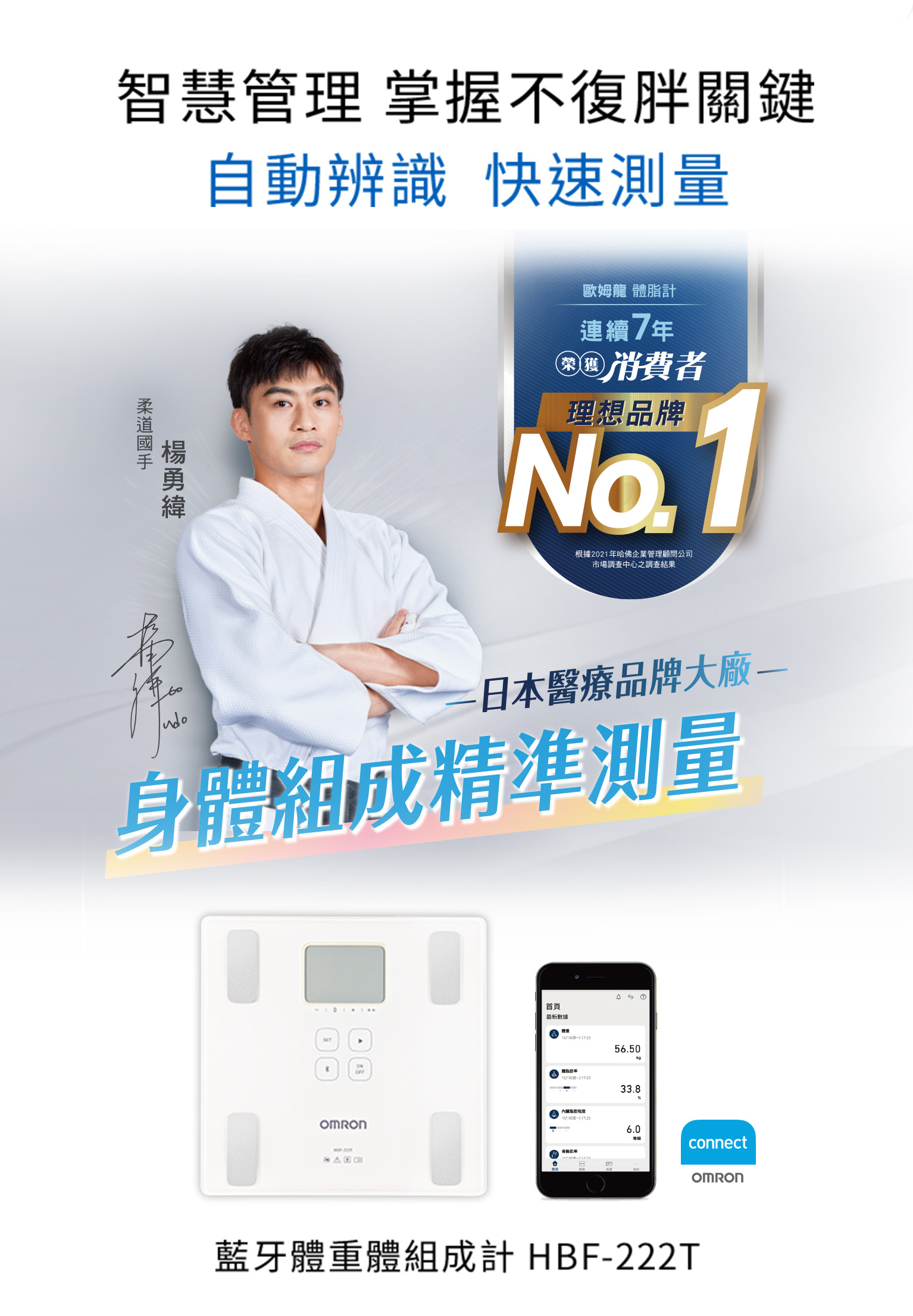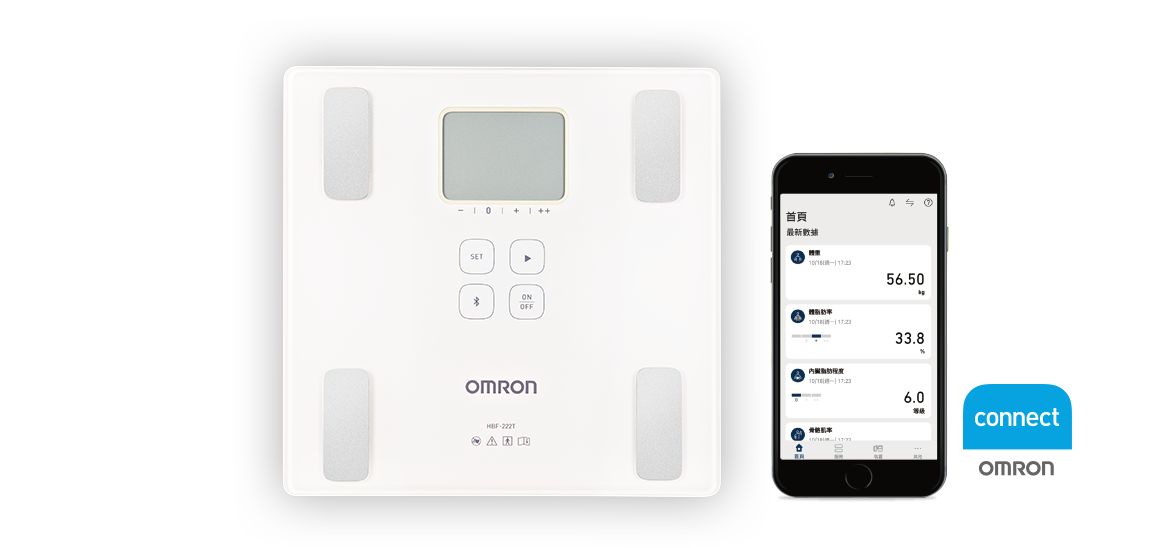 產品具有藍牙傳輸功能。將量測到的數據上傳至「OMRON connect」,輕鬆查看體組成變化。